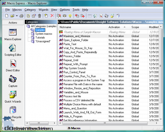 Macro Express Pro is an incredibly powerful macro recorder and playback utility. Automate all of your common tasks by simply turning on the recorder, performing the actions one time, then playing back the macro when needed. Or use over two dozen Quick Wizards to guide you through a series of questions and build the macro for you. To create more powerful macros, utilize the Scripting Editor.